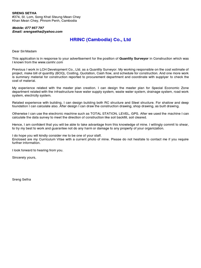 Dear hr, further to your advertisement in the manchester evening news last week, i would like to apply for the position of quantity surveyor at your leeds office. May 24, 2017 · quantity surveyor cover letter. My reputation managing mechanical materials and electrical departments is highlighted showing how my contributions have enhanced even the smallest project. Writing a great quantity surveyor cover letter plays an important role in your job search journey. Quantity surveyors work in the construction industry and are primarily responsible for the costs and contracts involved with a construction project.